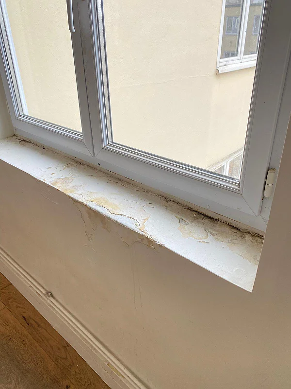 Cet appartement de trois pièces présentait un état général très dégradé, notamment au niveau des appuis de fenêtres fortement abîmés par des infiltrations d’eau, rendant toute mise en vente difficile selon l’agence immobilière.